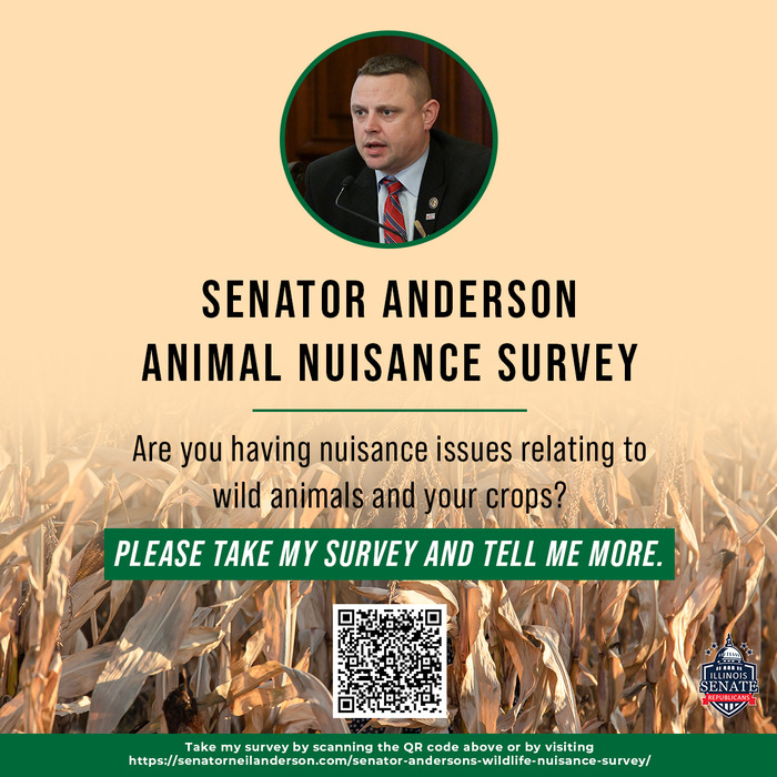 Senator Neil Anderson has developed a survey to address concerns from farmers in the 47th District regarding crop damage caused by wildlife, as well as develop potential solutions to the problem.