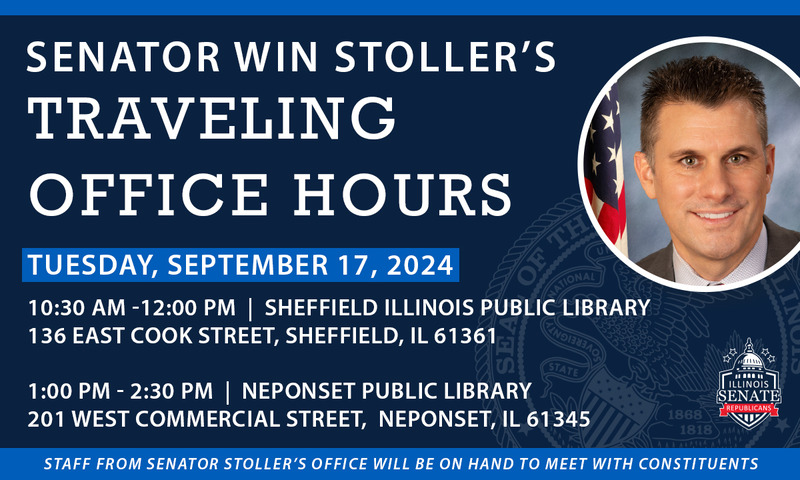 Staff for Senator Win Stoller (R-Germantown Hills) will be holding traveling office hours throughout the 37th District during the month of September. “Traveling office hours are a great way for constituents to reach my office without having to drive to my district offices,” said Senator Stoller. “Whether you need help with a FOID Card, a licensing issue, or any other state related issue, my staff will be on hand to help you navigate any issues or concerns you many have with state government.”