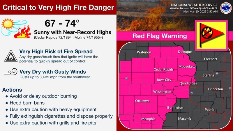 Today, meteorologists warn of a severe fire risk due to the combination of sunny skies, gusty southwest winds, and temperatures soaring to near-record highs, ranging from the upper 60s to mid-70s. These conditions heighten the danger of any grass or brush fires rapidly spreading out of control. It’s crucial to adhere to any burn bans currently in place and avoid burning today. Ensure cigarettes are fully extinguished and disposed of safely. Exercise extra caution when grilling, using fire pits, or operating heavy machinery. Stay vigilant and prioritize safety to prevent potential fire outbreaks.