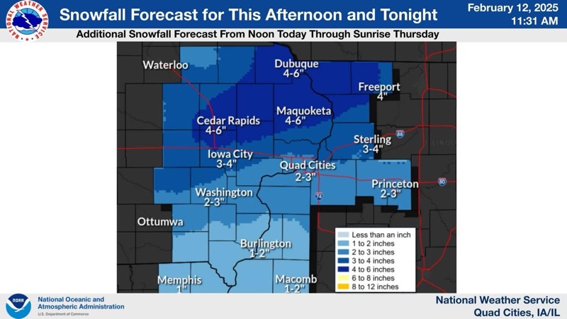 Additional snow this afternoon and tonight is forecast in the 4 to 6 inch range north of Interstate 80, and 1 to 4 inches south.