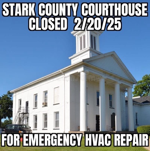 The Stark County Courthouse is closed today for a water line break and emergency HVAC repairs. At this time, the closure is for today, February 20, 2025, only.