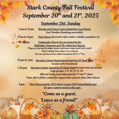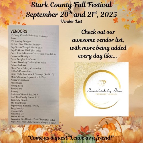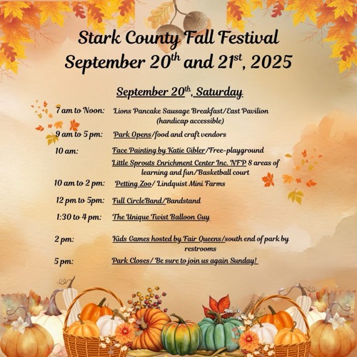 Peg Gray and Connie Osborne joined Wake Up Tri-Counties to talk about the 2025 Stark County Fall Festival this weekend. Excitement is building as the Stark County Fall Festival returns to Thomas Park in Wyoming on September 20th and 21st. Attendees can look forward to delicious food, including the beloved Wyoming Lions Club Pancake & Sausage Breakfast on Saturday morning from 7 AM until noon. On Sunday, enjoy a breakfast of biscuits and gravy and eggs from 7 to 11 AM, served by Cozzi Ranch, and don’t miss the community church service at 10:30 AM. Family fun takes center stage with face painting, a petting zoo, games, karaoke, and a variety of kid-friendly activities. Shoppers will appreciate an impressive array of vendors, ranging from jewelry and baked goods to unique gifts and crafts. Organizers encourage new vendors to join early for smoother planning, though spots remain open up to event time. For details or to reserve a space, contact Peggy Gray at 309-695-6575. There’s something for everyone at this community tradition established in 2000. Mark your calendars for a weekend of unforgettable fun. Visit their Facebook page for more information.