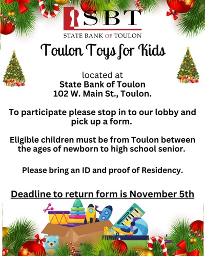 The State Bank of Toulon is launching its annual Toulon Toys for Kids program, inviting families with children from newborns to high school seniors to take part. Registration forms can be picked up at the bank’s main lobby at 102 West Main Street. Families will need to provide identification and proof of residency to qualify. The initiative aims to ensure every eligible child in Toulon enjoys a brighter holiday season. Residents are encouraged to act quickly, as the registration deadline is November 5th. For full details, visit the State Bank of Toulon or call the branch at 309-286-2861.