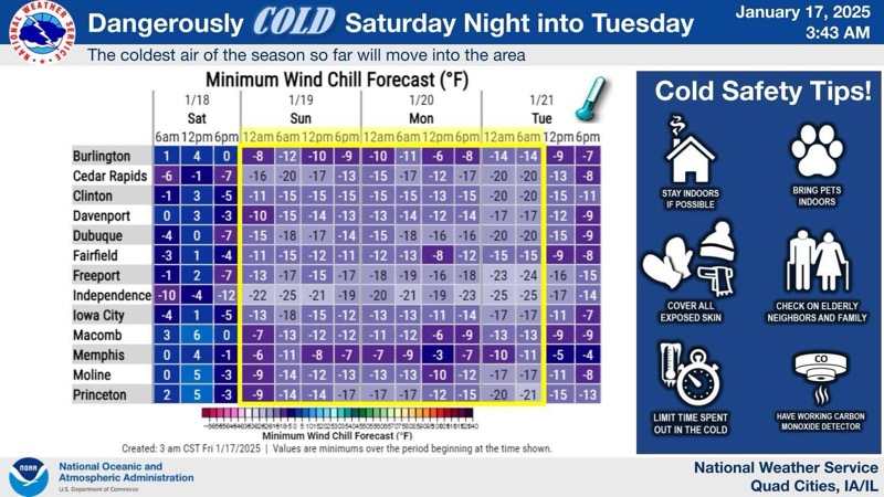 The Henry County Office of Emergency Management reminds residents to be safe as an arctic airmass moves into the region Sunday through Tuesday. According to the National Weather Service, dangerous wind chills are expected after midnight tonight through Monday morning. Wind chills between -15 and -25 degrees may occur early Monday. Even colder wind chills are expected tomorrow night into Tuesday, with some wind chills near -35 degrees! Frostbite is a concern when temperatures drop below zero. If you must be outside, dress appropriately and limit exposure time outside. Don’t forget about your pets during this time, and limit their time outside. If you have outside animals, state statutes mandate that they must have proper shelter from the weather, food, and water.