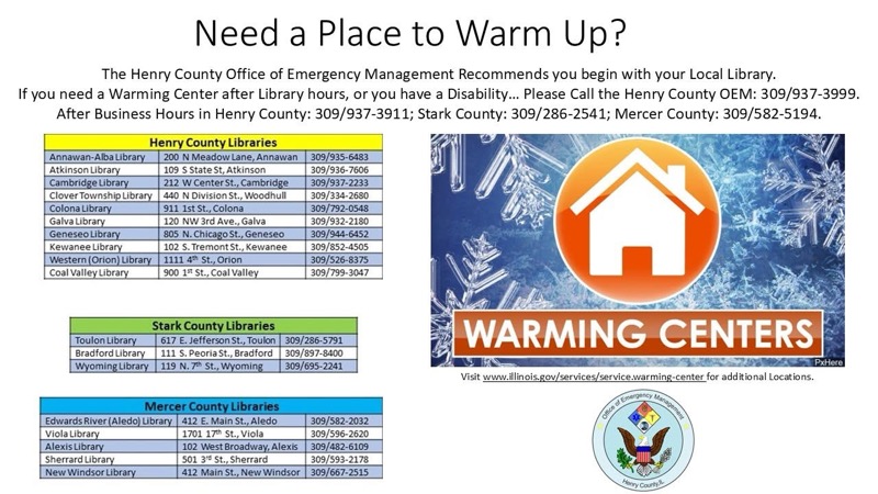 The graphic below provides a list of libraries that are warming centers around Henry County. If you need a warming center outside the local library hours or you have a disability, call the Henry County OEM at 309-937-3999.