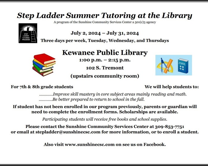 The Summer Step Ladder Tutoring program starts on Tuesday, July 2, 2024, from 1 to 2:15 PM at the Kewanee Public Library. The tutoring sessions are on Tuesday, Wednesday, and Thursday each week through July 31st. The Step Ladder program serves Kewanee students who have completed the 6th, 7th, or 8th grade. The summer program focuses on Math and Reading. Students can attend the summer session and during school terms for a total of three years.  Students receive free school supplies at the end of the summer session and supplies throughout the school year as needed. To enroll a student or for questions, call Etta LaFlora at 309-853-7751. Visit https://www.sunshinecsc.com/step-ladder-tutoring-program.html or their Facebook Page for more information.