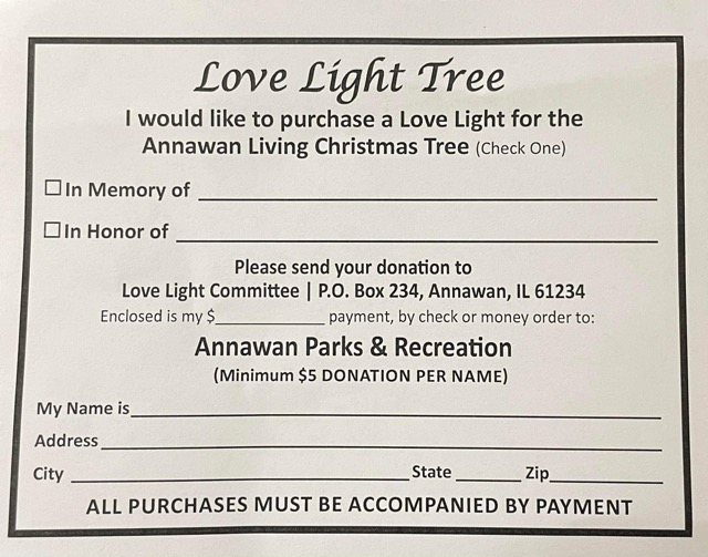 The Annawan Parks & Recreation is hosting its annual Love Light Campaign, inviting community members to purchase lights for the Living Christmas Tree in memory or honor of loved ones. Each light requires a minimum donation of five dollars, sent to the Love Light Committee at P.O. Box 234, Annawan, Illinois. Love Light Tree forms are due November 18, 2024. The 2024 Celebration is November 24th.