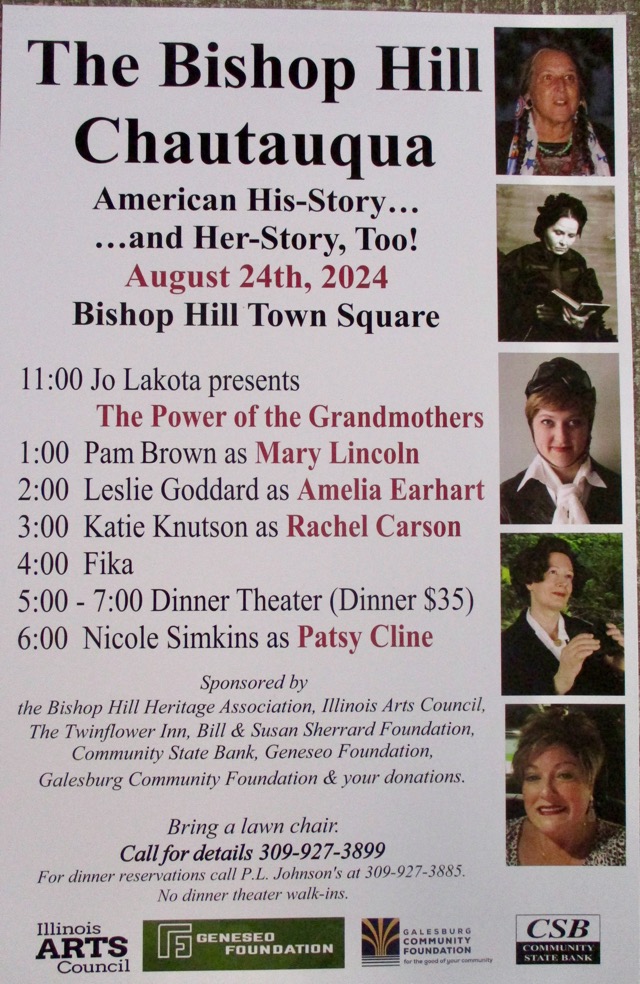The 2024 Bishop Hill Chautauqua is sponsored by the Bishop Hill Heritage Association, Community State Bank, Galesburg Community Foundation, Geneseo Foundation, Illinois Arts Council, Bill and Susan Sherrard Foundation, the Twinflower Inn Bed and Breakfast, and generous donations from the community. Regional Media is our major media sponsor. The audience is encouraged to bring a lawn chair. For more information about the Chautauqua, email [email protected] or call 309-927-3899