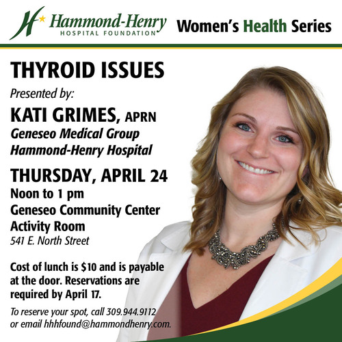 The Hammond-Henry Hospital’s Women’s Health Series is hosting an insightful session focused on thyroid issues. This event will be held at the Geneseo Community Center, with Kati Grimes, APRN, leading the discussion on April 24, 2025, from noon to 1 PM. Attendees can enjoy lunch for a $10 fee, which is due upon entry. To participate, reservations must be arranged by April 17th. Those interested can secure their spot by calling 309-944-9112 or sending an email to [email protected]. This session offers a valuable opportunity for community members to gain knowledge on thyroid health.