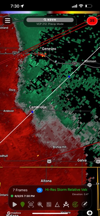 Broad circulation between Alpha and Cambridge at 7:29 PM. Storm track shows it crossing Highway 81 towards Highway 6 in Atkinson.