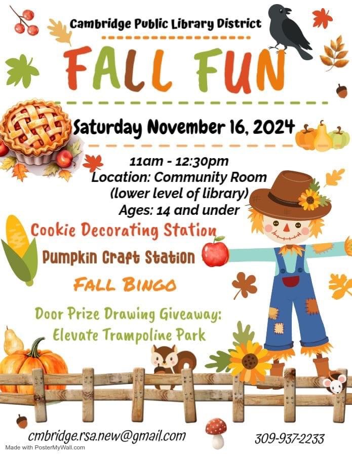 The Cambridge Public Library invites children aged 14 and under to a Fall Fun event on Saturday, November 16, 2024. Activities will take place from 11 AM until 12:30 PM and include cookie decorating, pumpkin crafts, and fall-themed bingo. A door prize drawing will also take place, featuring tickets to Elevate Trampoline Park.