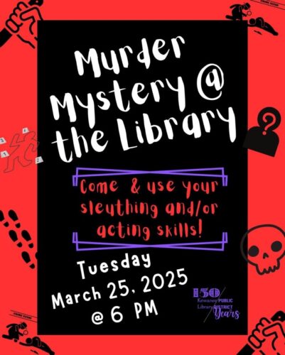 Calling all mystery enthusiasts! The Kewanee Public Library is hosting an intriguing Murder Mystery event on Tuesday, March 25, 2025. Starting at 6 PM in the 2nd Floor Community Room, participants are invited to exercise their detective and acting abilities. This engaging community event promises to offer a unique experience for all involved. Entry is through the north-side elevator. Those interested in joining the cast can contact Gen or Heather at 309-852-4505 for further information. Sharpen your wits and prepare for a thrilling evening!