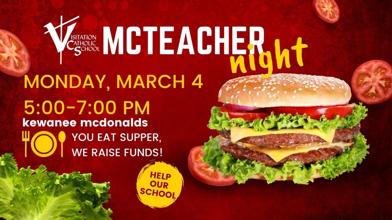Eat dinner at Kewanee McDonalds on Monday, March 4, 2024, from 5-7 PM and support Visitation Catholic school at the same time. Visitation Catholic School teachers and staff will be there serving your orders, from 5-7 PM, and a portion of all sales go to the school.