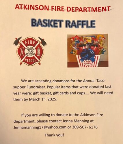 The Atkinson Fire Department is preparing for its annual Taco Supper Fundraiser and accepting donations for a basket raffle. Popular items from last year included gift baskets, gift cards, and cups. Donations are needed by March 1st, 2025. To contribute, contact Jenna Manning at [email protected] or call 309-507-6176.