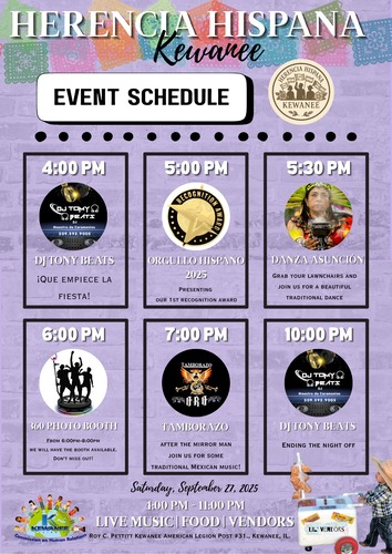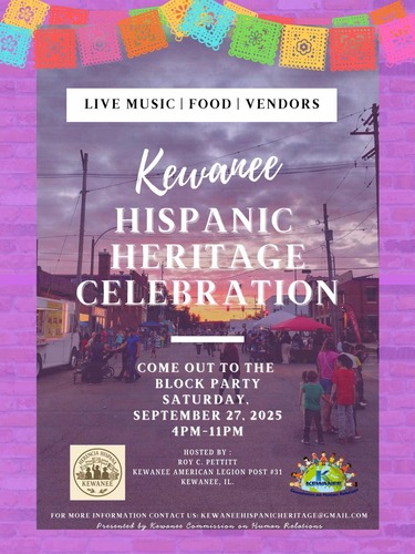 Come out and support the Kewanee Hispanic Heritage Celebration on Saturday, September 27th. The festivities will run from 4 to 11 PM at the Kewanee American Legion, located at 116 East 3rd Street. Hosted by the Kewanee Commission on Human Relations, the celebration promises an evening of live music, delicious food, and local vendors, highlighting the rich cultural traditions of the Hispanic community. Organizers invite residents to enjoy the festivities and support the ongoing efforts to promote diversity, inclusion, and cultural appreciation throughout the Kewanee area.