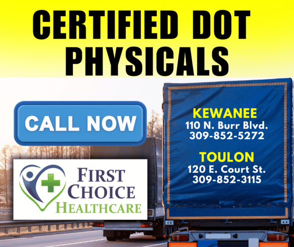 The Henry and Stark County Health Department, along with First Choice Healthcare, is offering DOT Physicals for area drivers at their Kewanee and Toulon clinic locations. These exams are a federal requirement for many commercial drivers, especially those transporting passengers, operating large or heavy vehicles, or moving hazardous materials. Qualified nurse practitioners, certified as DOT medical examiners, will conduct the physicals. Drivers taking medications for conditions such as diabetes, sleep apnea, or mental health issues must bring a clearance letter from their provider.