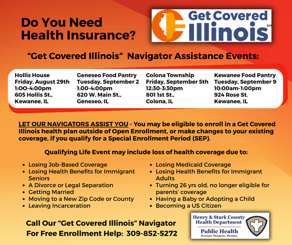 The Henry and Stark County Health Departments, together with the Get Covered Illinois Navigator Program, are reaching out to residents in need of health insurance. Health Insurance Navigators will be on-site at several local events: Geneseo Food Pantry on September 2nd from 1 to 4 pm, Colona Township Hall on September 5th from 12:30 to 3:30 pm, and Kewanee Food Pantry on September 9th from 10 am to 1 pm. Navigators will assist with comparing health plans, applying for coverage, and finding financial help or Medicaid options for those who qualify. Call 309-852-5272 to make an appointment or for more information.