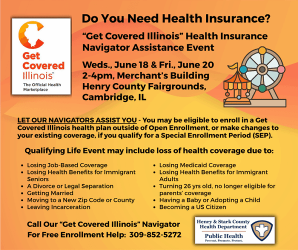 The Henry and Stark County Health Departments, along with the Get Covered Illinois Navigator Program, invite residents seeking health insurance to visit the Merchant’s Building at the Henry County Fairgrounds in Cambridge. Navigators will be available on Wednesday, June 18th, and Friday, June 20th, from 2 to 4 PM, offering free assistance with finding and applying for affordable health coverage. Attendees can also learn about qualifying for financial aid, Medicaid, or other programs and get help understanding their current benefits. Special enrollment periods allow many to make changes outside the usual open enrollment following major life events. For more information, call 309-852-5272.