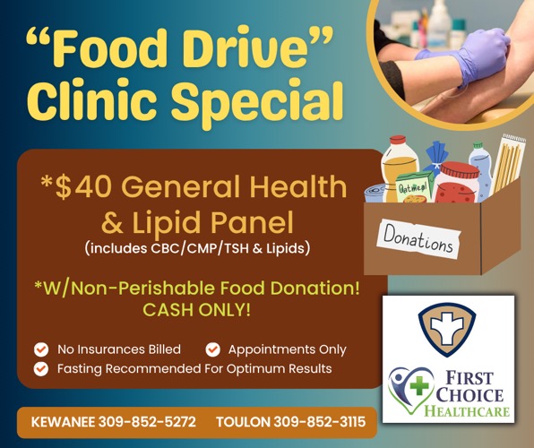 The Henry and Stark County Health Departments, together with First Choice Healthcare Clinics in Kewanee and Toulon, have extended their General Health and Thyroid Panel Blood Test special to benefit local food pantries. The clinic is offering the test for just $40, cash only, when paired with a donation of non-perishable food items, through January 1st. The test includes a full cholesterol panel and is recommended with fasting for best results. Residents interested in supplementing their annual health check-up can call 309-852-5272 for Kewanee or 309-852-3115 for Toulon to make appointments. Non-perishable food donations are welcome during business hours.