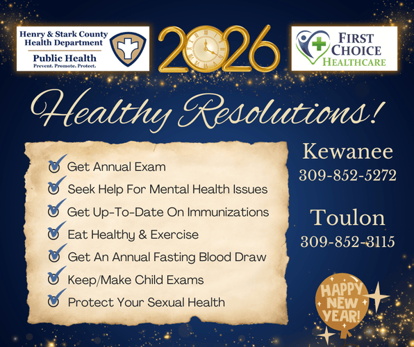 As many look ahead to 2026 and set New Year’s resolutions, the Henry and Stark County Health Department is encouraging healthy choices with its annual checklist. From scheduling an annual exam and keeping up with immunizations to focusing on mental health and regular exercise, these resolutions target long-term wellness for the whole family. The First Choice Healthcare Clinics in Kewanee and Toulon offer supportive services—ranging from women’s health exams and mental health counseling to immunizations and HIV prevention—all at affordable rates. Area residents can access additional support thanks to grant-funded programs designed to help goals become habits this year.