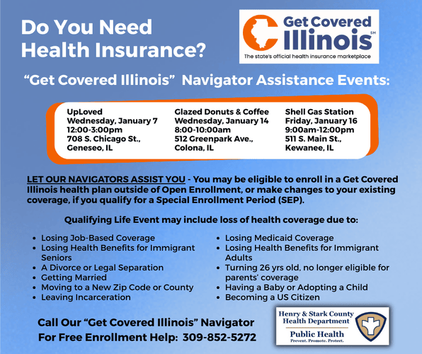 The Henry and Stark County Health Departments, together with the Get Covered Illinois Navigator Program, are offering free assistance for residents needing health insurance. Navigators will be available across several local events: UpLoved in Geneseo on January 7th from noon to 3 PM, Glazed Donuts & Coffee in Colona on January 14th from 8 to 10 AM, and Shell Gas Station in Kewanee on January 16th from 9 AM to noon. Experts can help with enrollment, navigating benefits, and determining financial assistance or Medicaid eligibility. For more information or to schedule help, contact 309-852-5272.