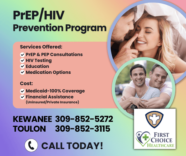 The Henry & Stark County Health Departments and First Choice Healthcare Clinics in Kewanee and Toulon are highlighting free and confidential HIV prevention services as part of their new PrEP/HIV Prevention program. Residents can access safe sex education, HIV testing, risk assessments, and receive prescriptions for PrEP or PEP medications to reduce the risk of infection. Financial assistance is available for those without insurance or with private plans, while Medicaid covers treatments entirely. The initiative aims to make HIV prevention accessible to everyone, regardless of insurance status.