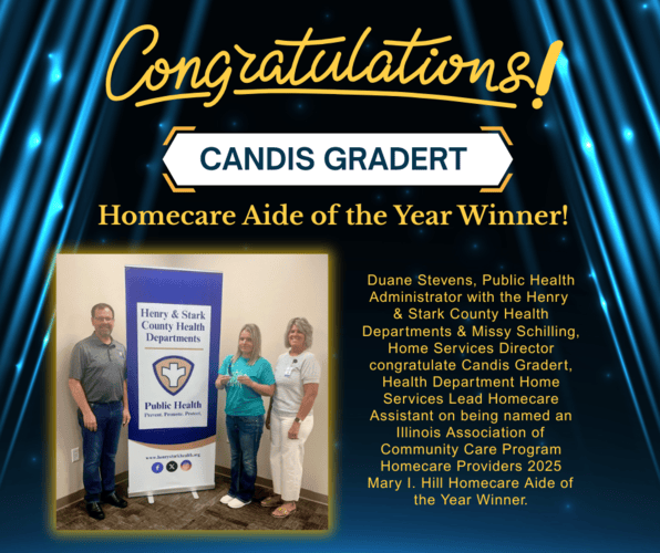 Candis Gradert, a dedicated lead homecare assistant with the Henry and Stark County Health Departments, has been named the 2025 Mary I. Hill Homecare Aide of the Year by the Illinois Association of Community Care Program Homecare Providers. Gradert, who’s served area seniors for over nine years, was recognized for her outstanding commitment to providing in-home assistance, including housekeeping, cooking, laundry, and personal care. Home Services Director Missy Schilling praised Gradert’s caring service and emphasized the ongoing demand for devoted aides. To learn more about homecare services or employment opportunities, contact the Health Department or visit their website and social media platforms.