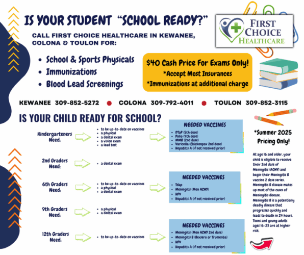 Students and parents planning for the next school year can now schedule sports and school physical exams at First Choice Healthcare Clinics in Kewanee, Colona, and Toulon. Physicals are available for just $40 cash, or you can bill your insurance by bringing your insurance details. The clinics are offering these exams for kindergartners through high school athletes all summer long. Parents are encouraged to book appointments early to beat the end-of-summer rush and should bring completed physical forms from their local schools. The clinics also provide required immunizations, TB checks, and lab tests at additional fees. More details are at henrystarkhealth.com, or follow them on Facebook, Instagram, and Twitter.