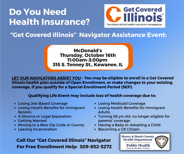 Residents of Henry and Stark County who need health insurance can find help this Thursday, October 16th, at the McDonald’s at 315 South Tenney Street in Kewanee. From 11 AM to 3 PM, health insurance Navigators from the Get Covered Illinois program will be on hand to guide people through finding affordable coverage, submitting applications, and comparing plans. They’ll explain financial assistance options and eligibility for Medicaid. Those who have experienced significant life changes—like losing job-based coverage, getting married, or moving—may qualify for a Special Enrollment Period. For more information, call 309-852-5272.