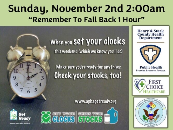 As residents prepare to set their clocks back next Sunday, November 2nd, for daylight saving time, local health officials urge everyone to use the opportunity to check their emergency preparedness stockpiles. The Henry and Stark County Health Departments, along with the Office of Emergency Management, are participating in the APHA’s “Get Ready: Set Your Clocks, Check Your Stocks” campaign. The initiative promotes reviewing emergency supplies to ensure adequate food, water, and essentials are on hand, and nothing has expired or is missing. Officials also encourage everyone to check smoke alarm batteries during this time. Visit aphagetready.org or henrystarkhealth.com for preparedness tips. Stay prepared for weather emergencies and health threats year-round.