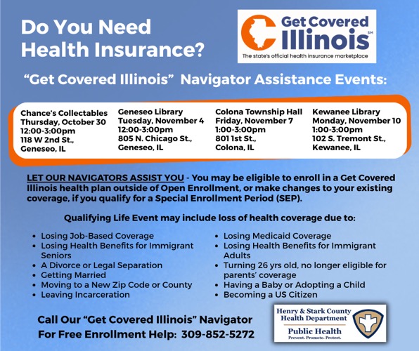 The Henry and Stark County Health Departments, together with the Get Covered Illinois Navigator Program, are reaching out to residents needing health insurance. Insurance Navigators will be available at several local events in Geneseo, Colona, and Kewanee over the next two weeks. Assistance includes comparing plans, applying for coverage, and checking eligibility for financial help or Medicaid. Life changes like marriage, job loss, or moving may qualify you for a Special Enrollment Period, allowing you to sign up or change coverage outside the regular enrollment window. For details or to set up a session, call 309-852-5272.