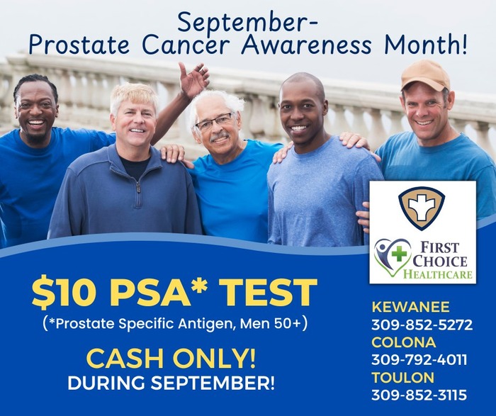Continuing RaeAnn and Seth talk about Men’s Prostate Cancer Awareness Month. It’s important to take the steps needed to prevent prostate cancer, and that is why First Choice Healthcare (located in Kewanee, Colona, Toulon) will be offering a $10 special for a PSA Test. This will be offered to all men aged (50-64 years old; however if you are under age required but have had a 1st degree family member diagnosed with prostate cancer, the special will apply. Interested? Make sure to stop into the First Choice Healthcare centers for your PSA test and act now through the month of September to receive the $10 special!