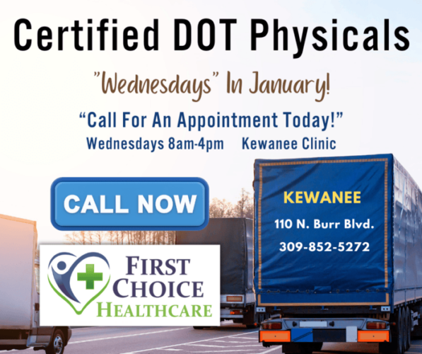 The Henry and Stark County Health Department is gearing up for a series of Certified DOT Physical Clinics, crucial for those who drive commercial vehicles. Set to take place every Wednesday in January at First Choice Healthcare Clinic in Kewanee, these clinics are designed to ensure drivers meet the necessary federal health standards to operate safely on the roads. Appointments are mandatory and can be secured by contacting the clinic directly. Drivers should be prepared for a comprehensive check-up, including vision tests, blood pressure monitoring, and other health assessments necessary to obtain their DOT medical certificate. In addition, those who are seeing a provider and are on medication for sleep apnea, diabetes, high blood pressure, cardiac, anxiety, ADHD/ADD, depression, other mental health issues, and seizures. Participants need to obtain a clearance letter from the medical provider and bring it to their appointment.