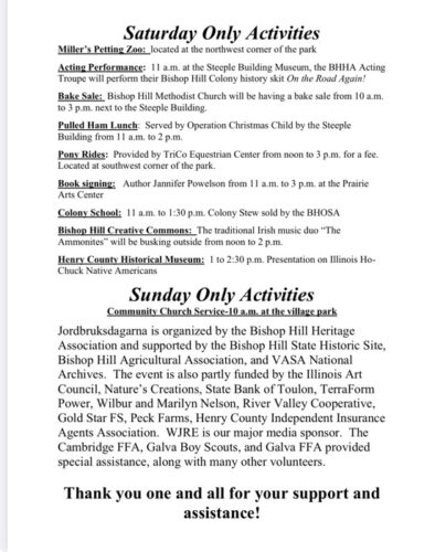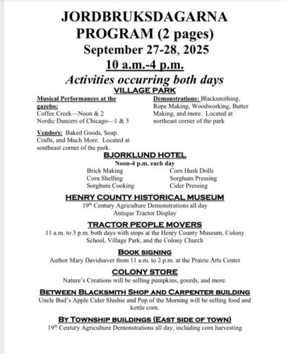 Jordbruksdagarna, Bishop Hill’s annual harvest celebration, returns this year with a rich lineup of activities for all ages. Organized by the Bishop Hill Heritage Association, this family-friendly event highlights Swedish traditions, historic demonstrations, and local crafts. Support comes from community organizations such as the Bishop Hill Agricultural Association, VASA National Archives, and sponsors including the Illinois Arts Council and Nature’s Creations. The event’s success relies on dedicated volunteers, with special help from the Cambridge and Galva FFA chapters and the Galva Boy Scouts. Major media support is proudly provided by Regional Media. Details can be found at www.visitbishophill.com.