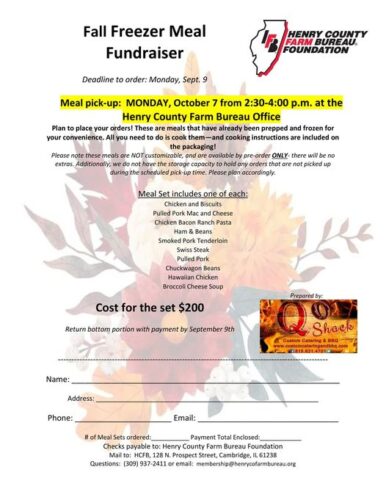 The Henry County Farm Bureau Foundation is holding a freezer meal fundraiser to raise funds for the educational programs of the Foundation. This is just an amazing opportunity not only to help support the future farmers of America but also to help families enjoy a well-prepared meal after a long day of work. Interested? The deadline for orders is September 9, 2024, and pick-up is October 7th at the office from 2:30 p.m. to 4 p.m.