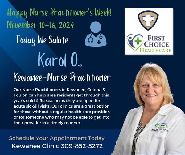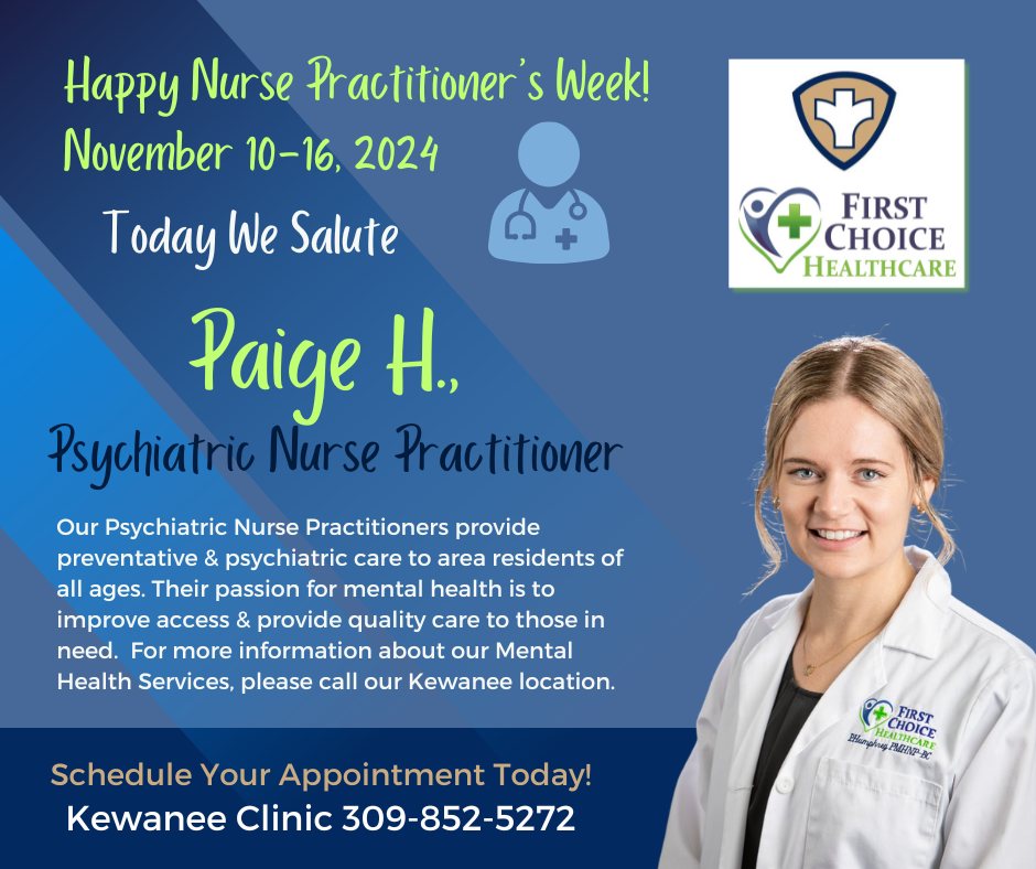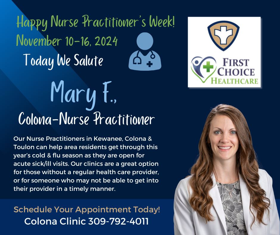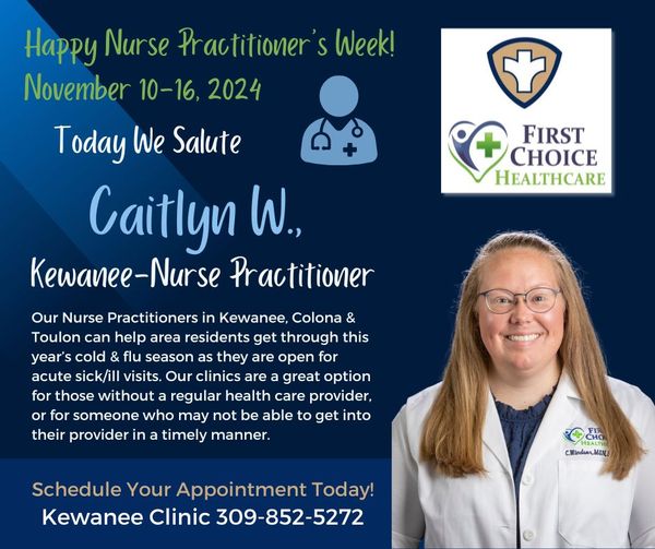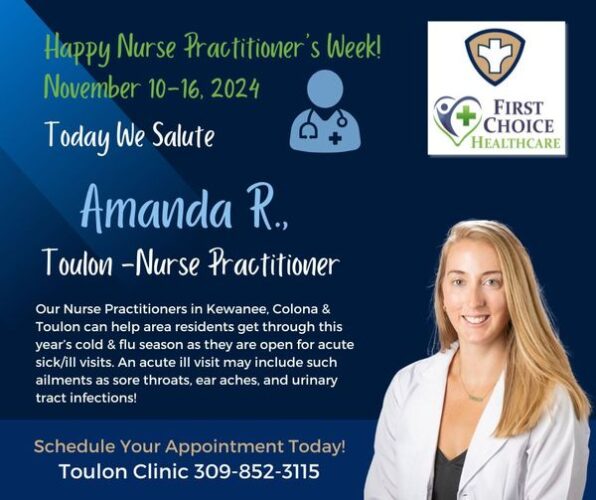 November 10th to 14th marks National Nurse Practitioners Week, celebrating dedicated professionals like Amanda Rediger from Toulon Clinic. Recognized for her outstanding service and commitment to patient care, Amanda embodies the expertise and compassion that nurse practitioners bring to the healthcare field. The Henry & Stark County Health Departments, along with First Choice Healthcare, are honoring these healthcare heroes who play a pivotal role in providing accessible, high-quality medical care to communities. Join us in acknowledging the vital contributions of nurse practitioners like Amanda and Caitlyn Windsor, from the Kewanee Clinic, across the nation.