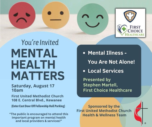 On Saturday, August 17th, at 10 AM, the First United Methodist Church and First Choice Healthcare are holding a Mental Health Matters program. The program is presented by Stephen Martell from First Choice Healthcare to provide services to the public and to let you know that you are not alone. Please enter in the east door of the parking lot.