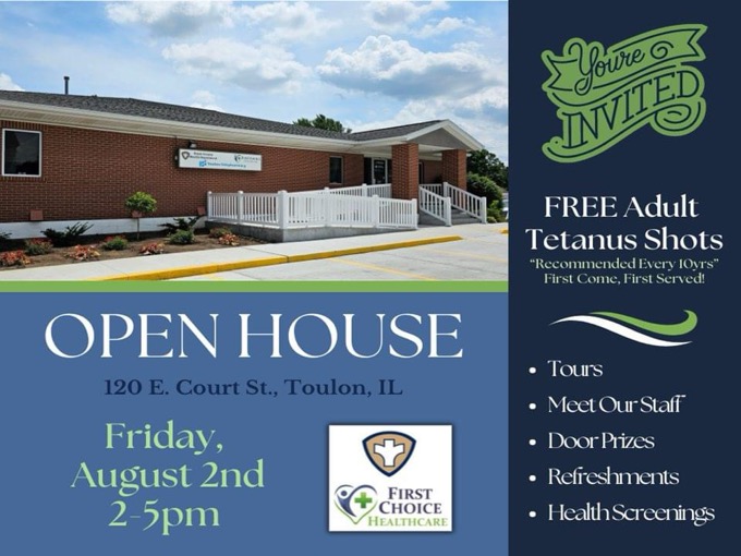 The new First Choice Healthcare Clinic in Toulon is hosting an open house on Friday, August 2nd, from 2 to 5 PM, at 120 E Court Street. “The August 2nd Open House will give all local residents, community partners and county officials the opportunity to meet our staff and tour the Department and Clinic; and enjoy some refreshments and sign up for door prizes.” Additionally, during the open house, adults (18 years+), can get a free Tetanus Booster Shot and blood pressure checks. The Tetanus shots will be given on a “first come, first served” basis, while supplies last. Tetanus boosters are recommended every 10 years in adulthood. Professions and activities strongly encouraged to stay up-to-date on tetanus vaccination include farming, construction, healthcare, childcare, food handling, and gardening. “We invite the public to our healthcare center that offers Stark County and area residents public health, primary care, mental health, tele-psych, WIC (Women, Infants & Children Food Supplemental Program), and “Coming Soon” pharmacy services all under one roof.”