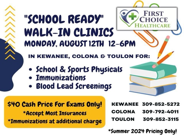 First Choice Healthcare clinics hold a special “Pop Up Walk-In” School and Sports exam day on Monday, August 12, 2024, from 12 to 6 PM. The clinics in Kewanee, Colona, and Toulon will offer the school and sports physicals for $40, and they ask you to bring your insurance information with you if you have insurance. The clinic will offer area Junior High and Senior High School Athletes, Freshmen, Sixth Graders, Kindergartners, and Preschoolers school or sports physicals. Please note that to help reduce wait times, arrive with your completed physical forms (obtained through your local school districts). For more information, call the First Choice Healthcare clinic nearest you: Kewanee, 110 N. Burr Blvd. 309-852-5272; Colona, 103 1st St. 309-792-4011; or Toulon, 120 E. Court St. 309-852-3115.