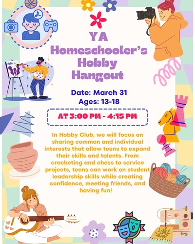 A unique event is on the horizon for young adult homeschoolers in the area. The Young Adult Homeschooler’s Hobby Hangout is scheduled for March 31st, from 3:00 pm to 4:15 pm. Students aged 13 to 18 have the opportunity to showcase their hobbies and talents in a relaxed, collaborative environment. It’s a wonderful chance for homeschooled teens to connect, learn, and share their passions with like-minded peers. If you need more details or wish to participate, reach out to Kennedy at 309.852.4505. Get ready to engage, explore, and enjoy an afternoon of creativity and camaraderie!