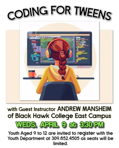 Exciting learning opportunities await young minds as “Coding for Tweens” returns, led by Mr. Andrew Mansheim from Black Hawk East College. This introductory coding session, aimed at students aged 9 to 12, will unfold in the 2nd Floor Community Room. The program promises to equip budding programmers with skills vital for today’s digital age while ensuring a fun and engaging experience. Interested participants can secure their spot by registering with the Youth Services Staff, either in person or via phone at 309-852-4505 ext. 340. Don’t miss this chance to dive into the world of coding!