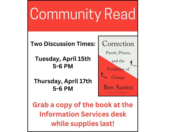 The city library invites all to participate in its Community Read event focused on Ben Austen’s compelling work, “Correction: Parole, Prison, and the Possibility of Change.” The exploration of the justice system’s intricacies will spark insightful discussions. Join fellow readers for an engaging conversation on Tuesday, April 15th, from 5 to 6 pm, or Thursday, April 17th, at the same time. Secure your copy at the Information Services Desk, located on the Lower Level. This initiative seeks to foster community dialogue and reflection on important societal issues, drawing connections between literature and real-world experiences.