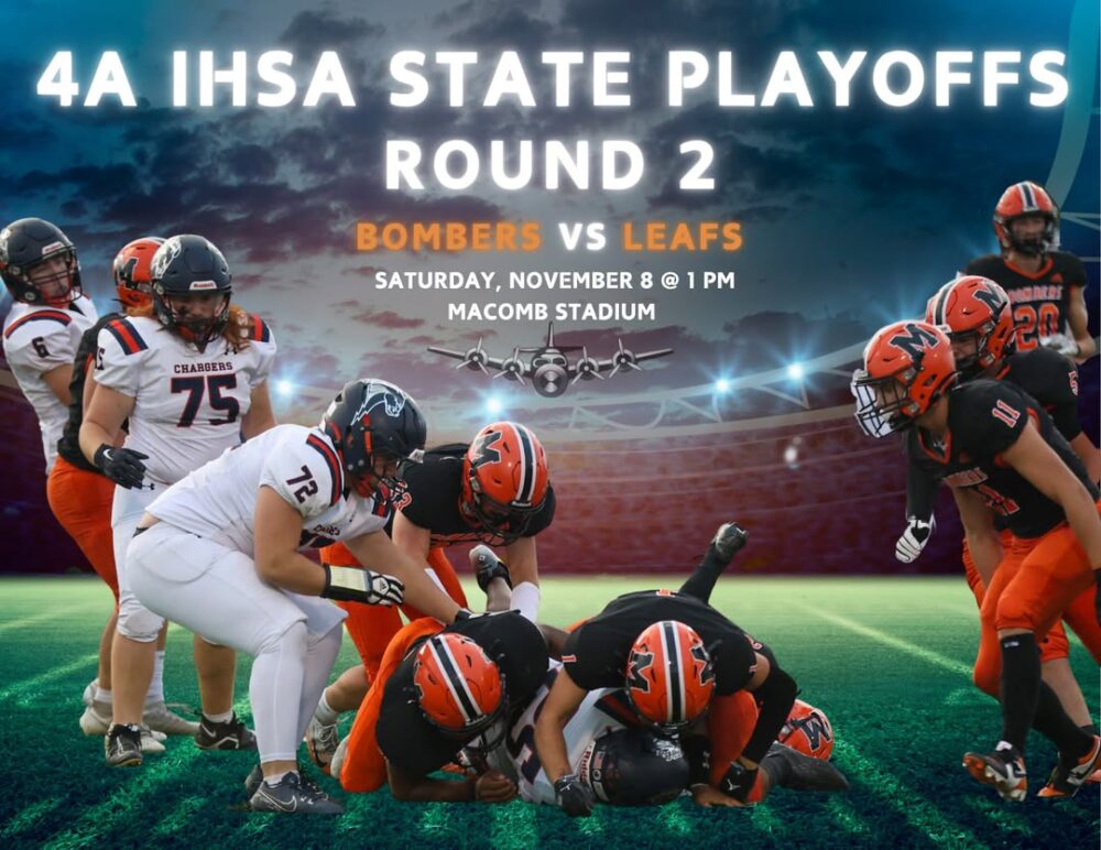 Get ready, Bomber fans! The Macomb School District is excited to announce that we will be hosting the second round of the 4A IHSA State Playoffs Saturday, November 8th at 1:00 PM at the MHS Stadium. We will be taking on the Geneseo Leafs, and we need our stands full and loud! Come cheer on our Bombers who have been working hard all season long. It’s going to be a perfect fall day for some Bomber football.