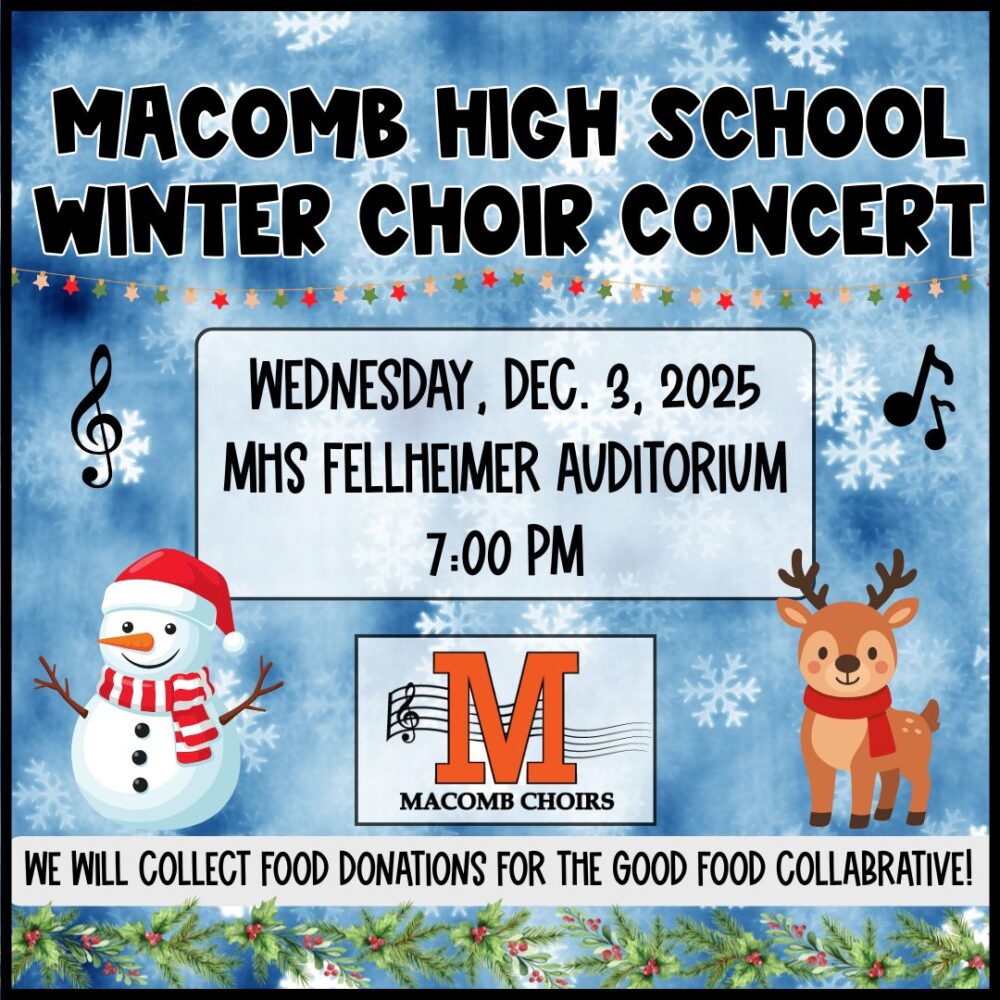 If you are looking for some holiday cheer, come enjoy the Macomb Choirs concert, Wednesday, December 3rd at 7:00!