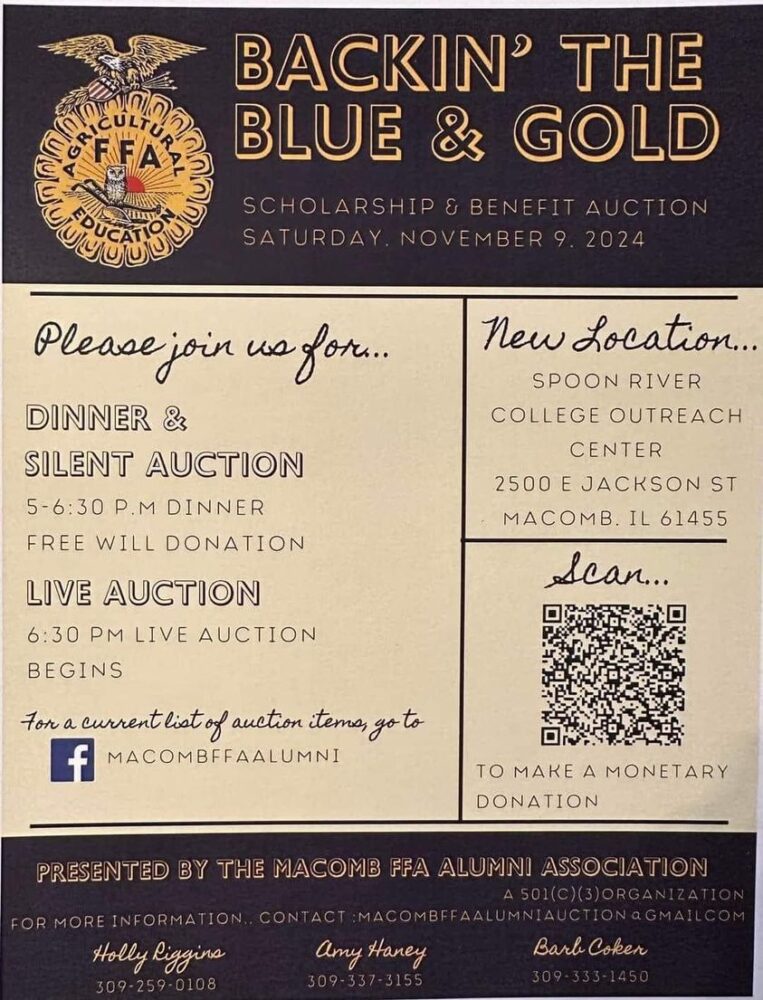 Join the Macomb FFA Alumni in supporting Macomb ag education and FFA on Saturday evening at Spoon River College Outreach Center (new location). Dinner and silent auction is from 5-6:30 with the live auction starting at 6:30. Auction items can be found on the Macomb FFA Alumni Chapter Facebook page.