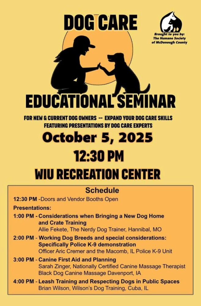 Mark your calendars for this FUN educational event for dog lovers! Oct 5th, 12:30 – 5. WIU REC Center
