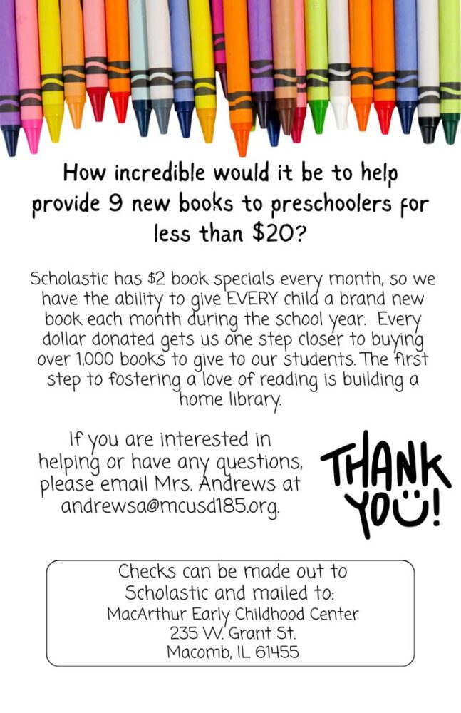 Reading is FUNdamental, so MacArthur Early Childhood Center would love to give every student a free book every month this school year. Thanks to Scholastic’s $2 book specials, each child can be sponsored for just $18 for the whole year. Every dollar donated will be used towards our total goal of over $2000. Can you help? #mac185