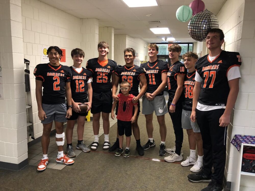 Rylie Cheatham, a first grader in Mrs. Roger’s class, and his brother Kyler Cheatham and the Macomb Bombers football players visiting during Homecoming week. #MAC185