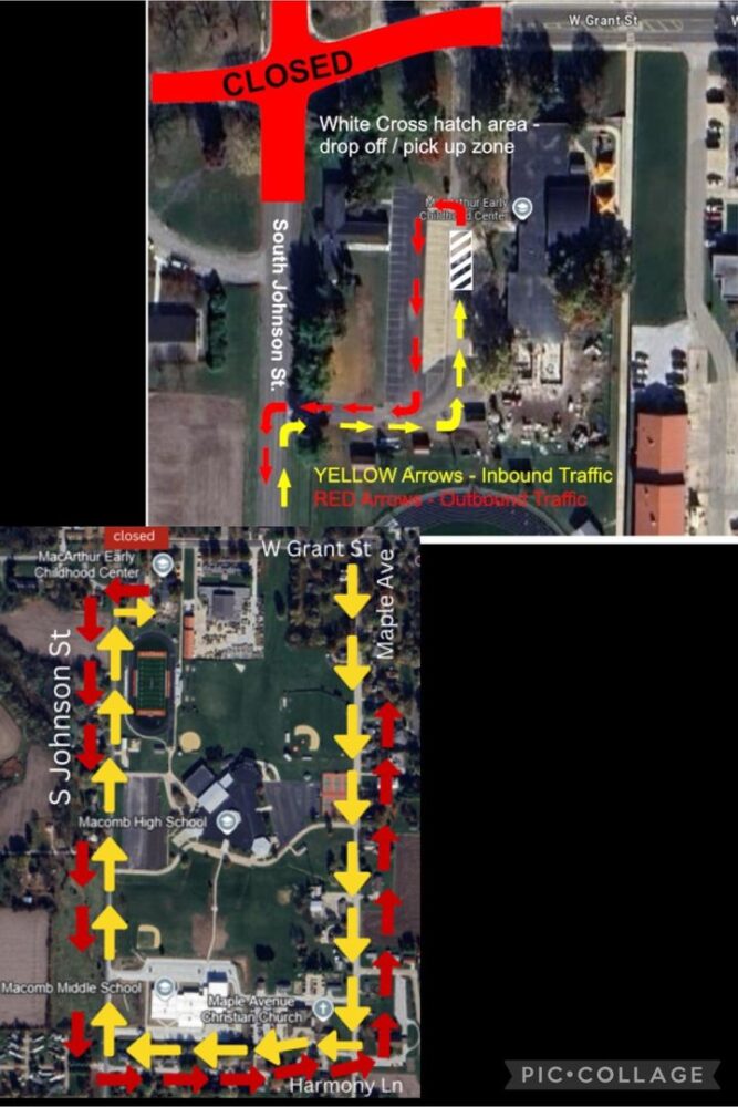 Starting Monday, October 7th, the Grant Street entrance to MacArthur will be closed. Incoming traffic will enter MacArthur from Johnson Street. Drivers can access Johnson Street from Harmony Lane using Maple Avenue. MacArthur families are allowed to drive around the road closed sign that will remain posted on Johnson Street by the MHS parking lot. DO NOT CUT THROUGH MACOMB HIGH SCHOOL OR MACOMB MIDDLE SCHOOL TO ACCESS JOHNSON STREET. Incoming traffic will follow the yellow ar…rows on the map to drive towards the drop off lane. Outgoing traffic will follow the red arrows to loop out of the MacArthur parking lot and exit left using the north lane. DO NOT CUT THROUGH MACOMB HIGH SCHOOL OR MACOMB MIDDLE SCHOOL TO ACCESS MAPLE AVENUE. Thank you for helping keep our students safe while following MacArthur’s parking lot traffic guidelines. #MAC185