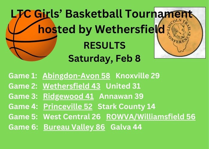 The LTC Girls’ Basketball Tournament continues at Wethersfield High School and Junior High gyms. On February 10th, games include Annawan versus Stark County and Ridgewood versus Princeville at the high school. West Central faces Galva, and ROWVA/Williamsfield takes on Bureau Valley at the junior high. The championship game between Abingdon-Avon and Wethersfield is set for February 12th.